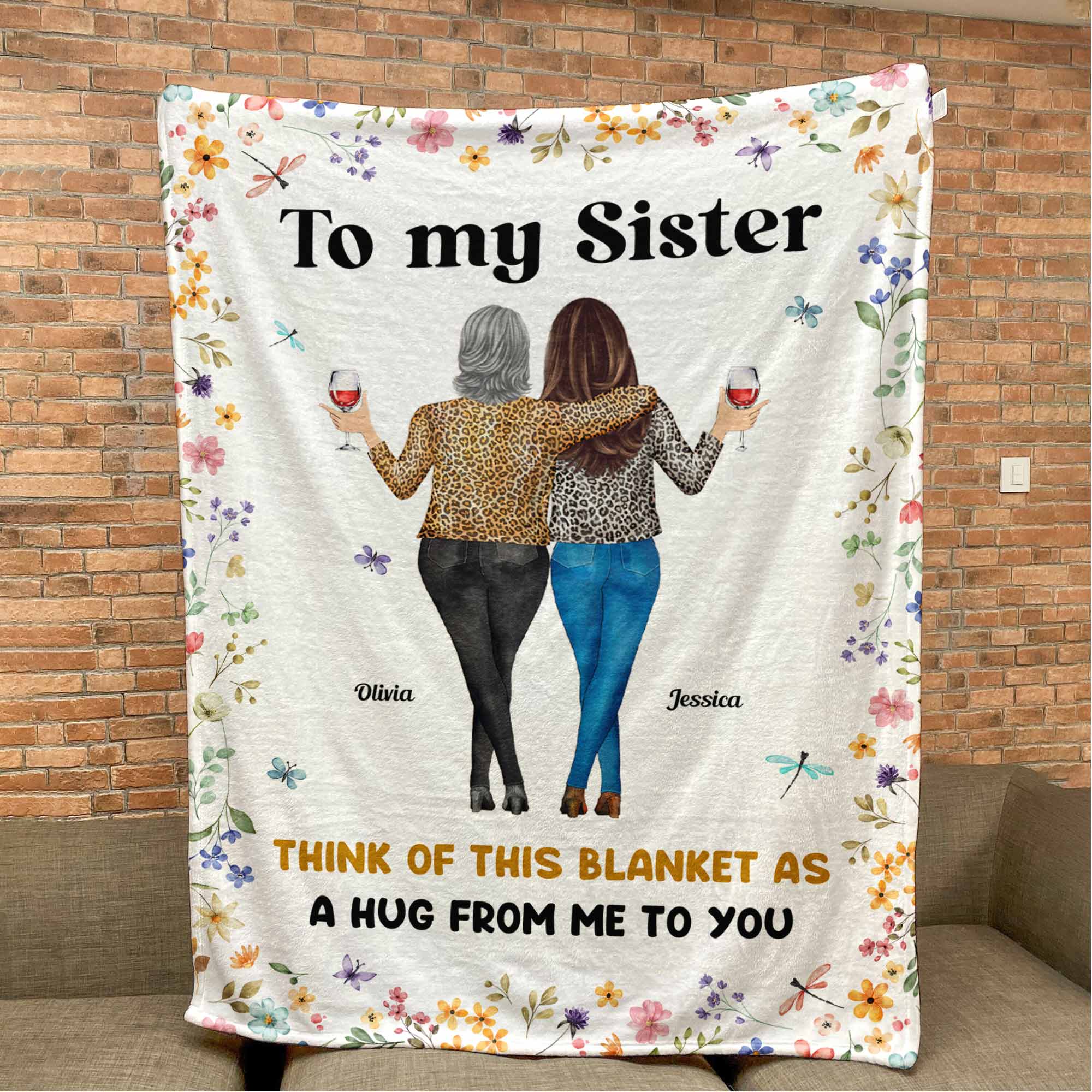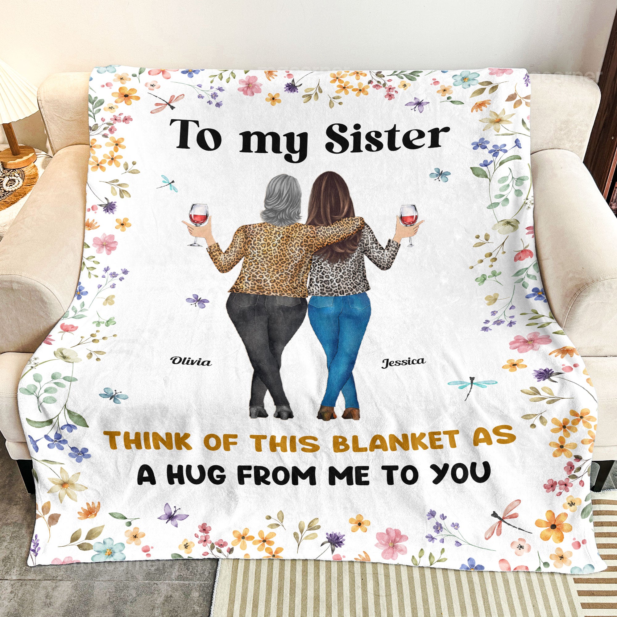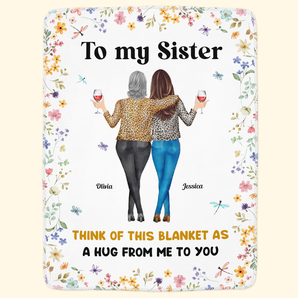 This **Personalized Sister Blanket** is the perfect way to show your sister how much she means to you. Featuring a heartfelt message, “Think of this blanket as a hug from me to you,” this blanket is designed to bring comfort and warmth to your sister every day. With the option to personalize the names, you can make this gift truly unique and special. The beautiful floral border and the illustration of two sisters sharing a moment together make it even more meaningful. Whether for her birthday, an anniversary, or just because, this personalized blanket is a thoughtful gift that will be cherished for years to come. It’s not just a blanket; it’s a constant reminder of your love and bond. Made with soft and durable fabric, this cozy blanket is perfect for any season. Let your sister feel your love and affection, even when you’re not together, with this customized blanket. A gift that’s sure to bring a smile to her face and warmth to her heart.