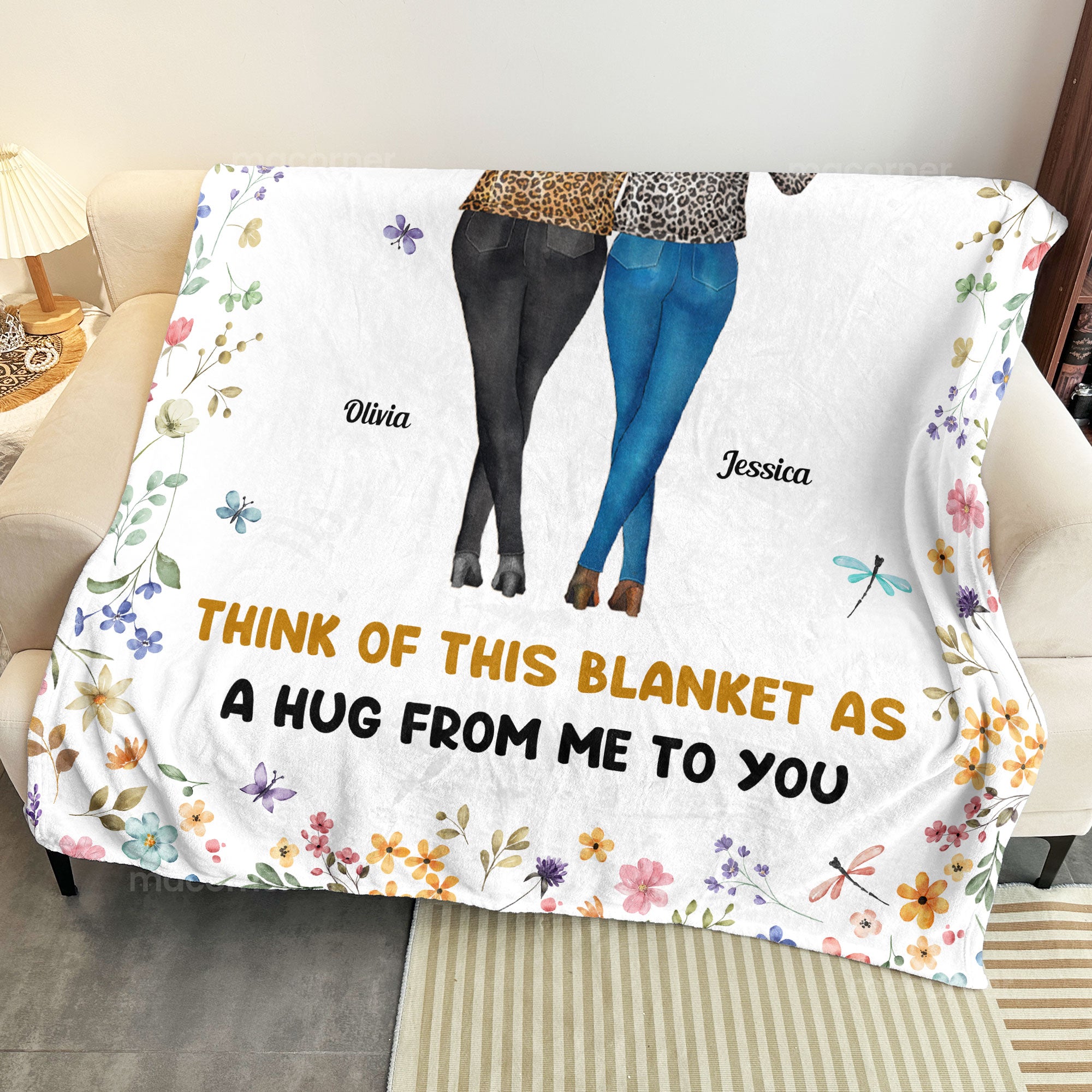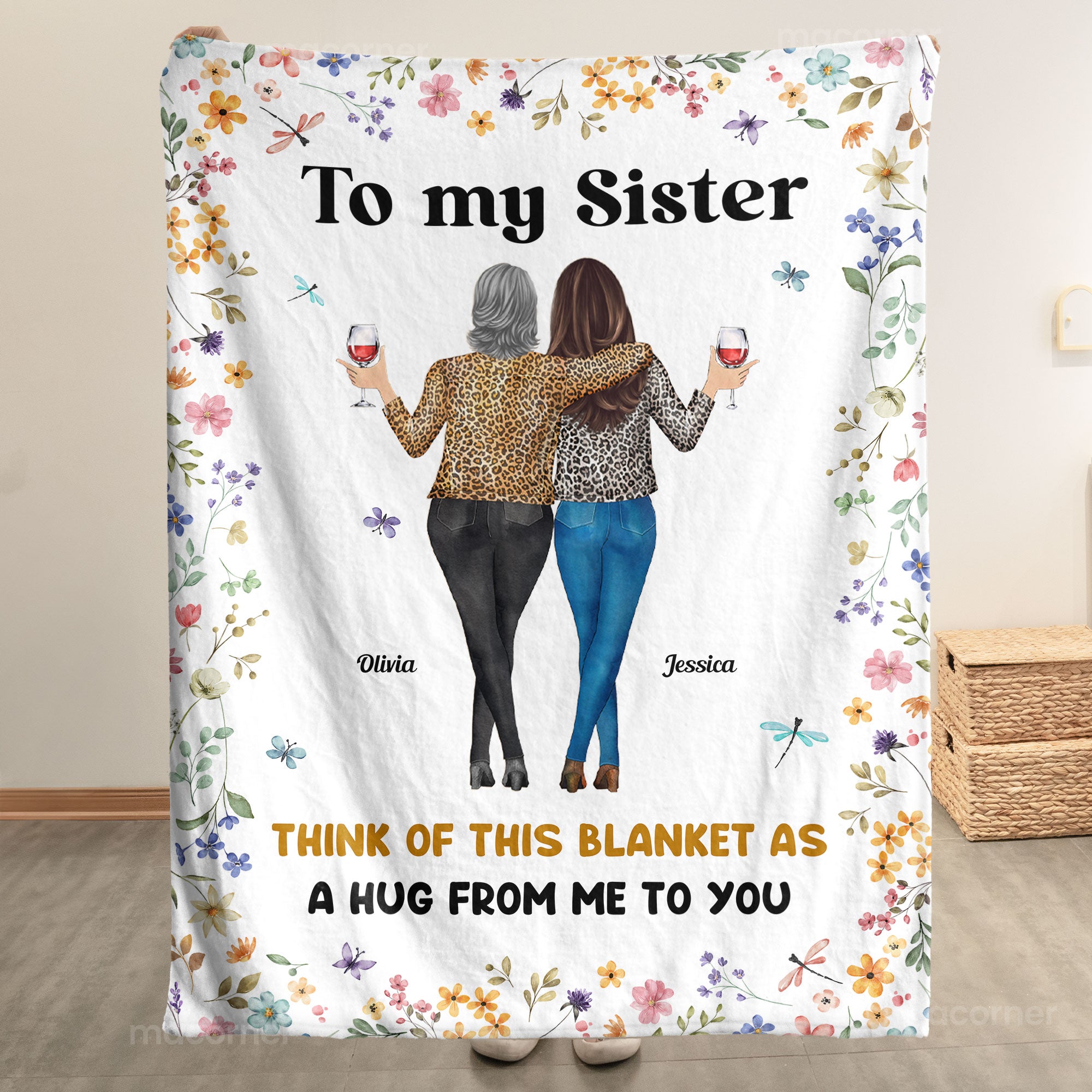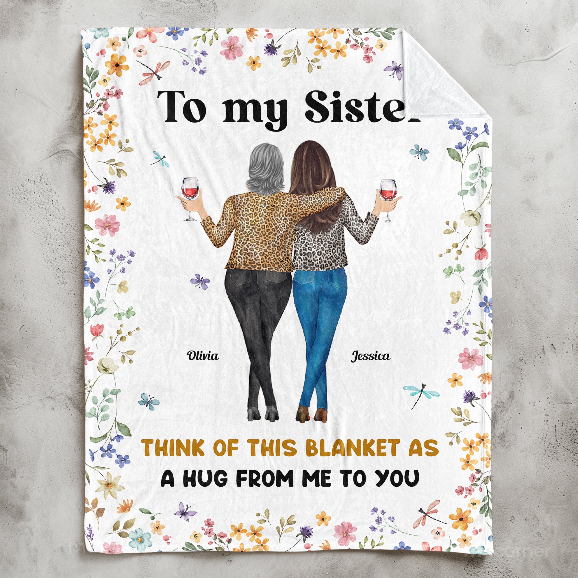 This **Personalized Sister Blanket** is the perfect way to show your sister how much she means to you. Featuring a heartfelt message, “Think of this blanket as a hug from me to you,” this blanket is designed to bring comfort and warmth to your sister every day. With the option to personalize the names, you can make this gift truly unique and special. The beautiful floral border and the illustration of two sisters sharing a moment together make it even more meaningful. Whether for her birthday, an anniversary, or just because, this personalized blanket is a thoughtful gift that will be cherished for years to come. It’s not just a blanket; it’s a constant reminder of your love and bond. Made with soft and durable fabric, this cozy blanket is perfect for any season. Let your sister feel your love and affection, even when you’re not together, with this customized blanket. A gift that’s sure to bring a smile to her face and warmth to her heart.